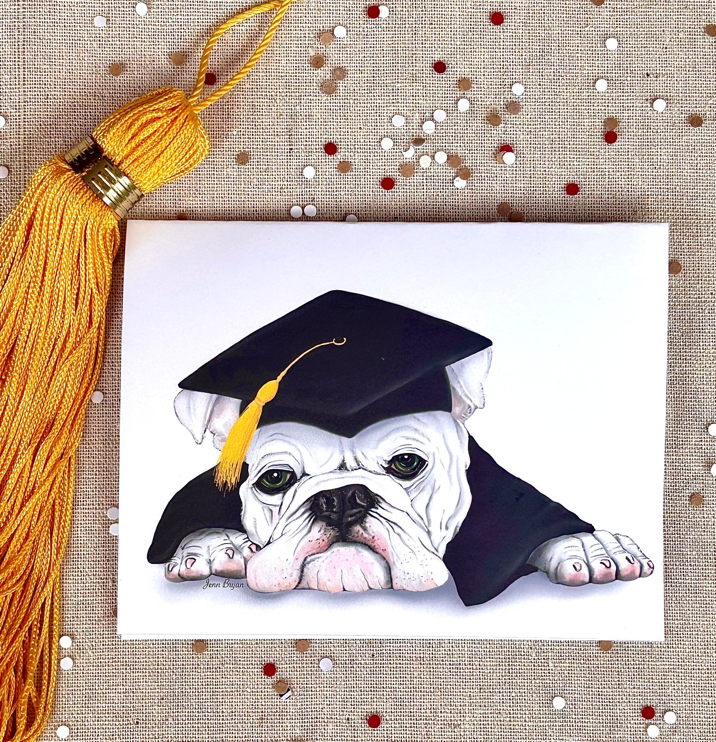 A Bulldog Graduation Notecard—a tasteful tribute to academic success. This elegantly and fun loving designed card features a bulldog in cap and gown, symbolizing perseverance and accomplishment.